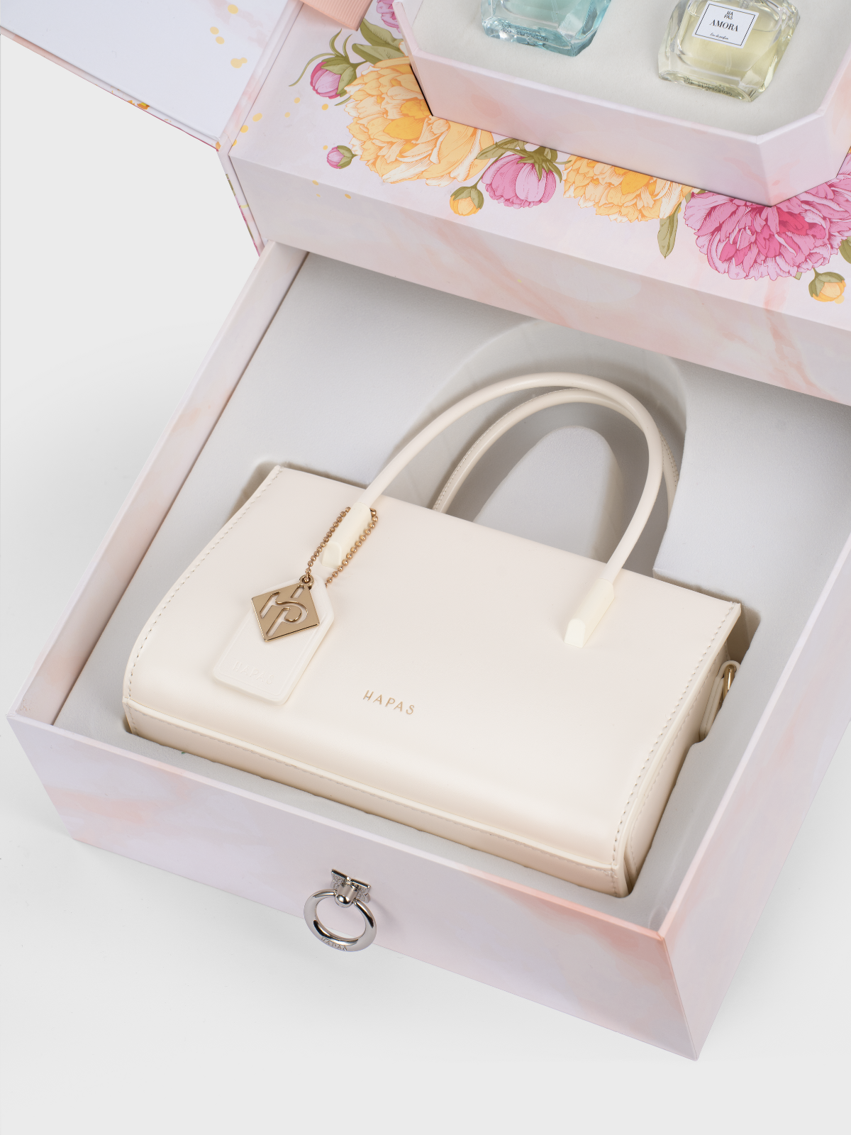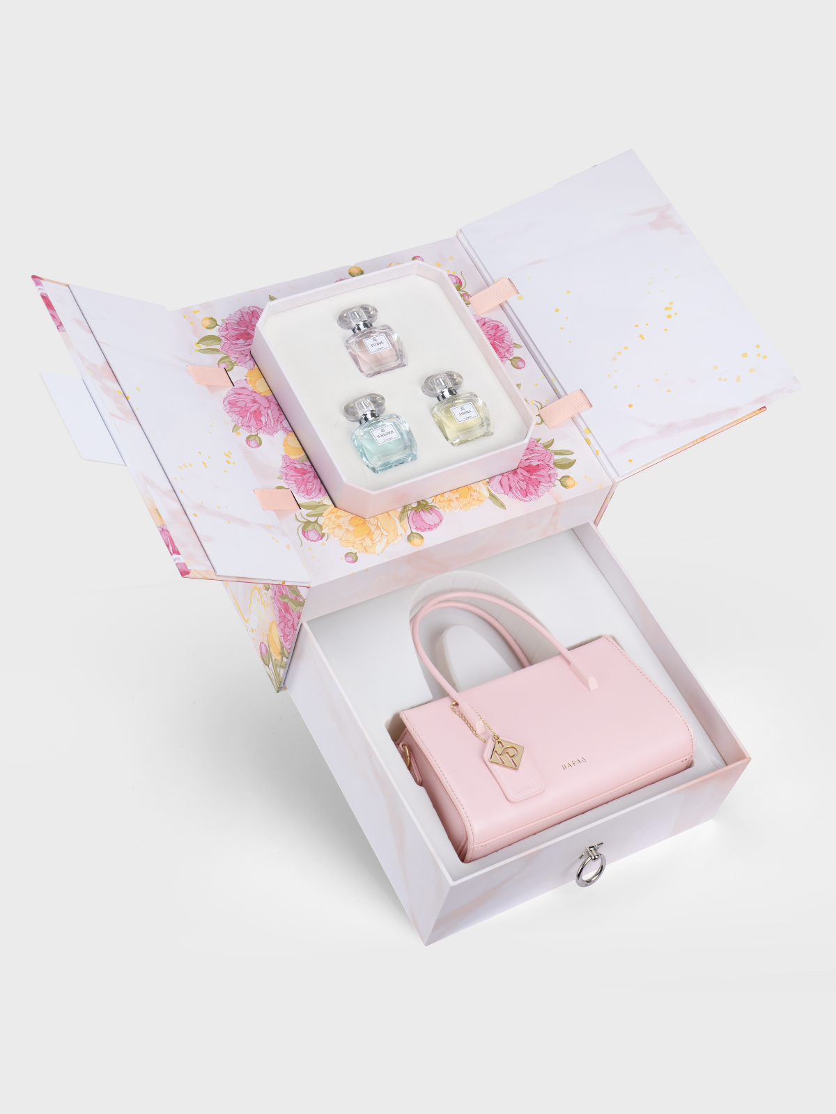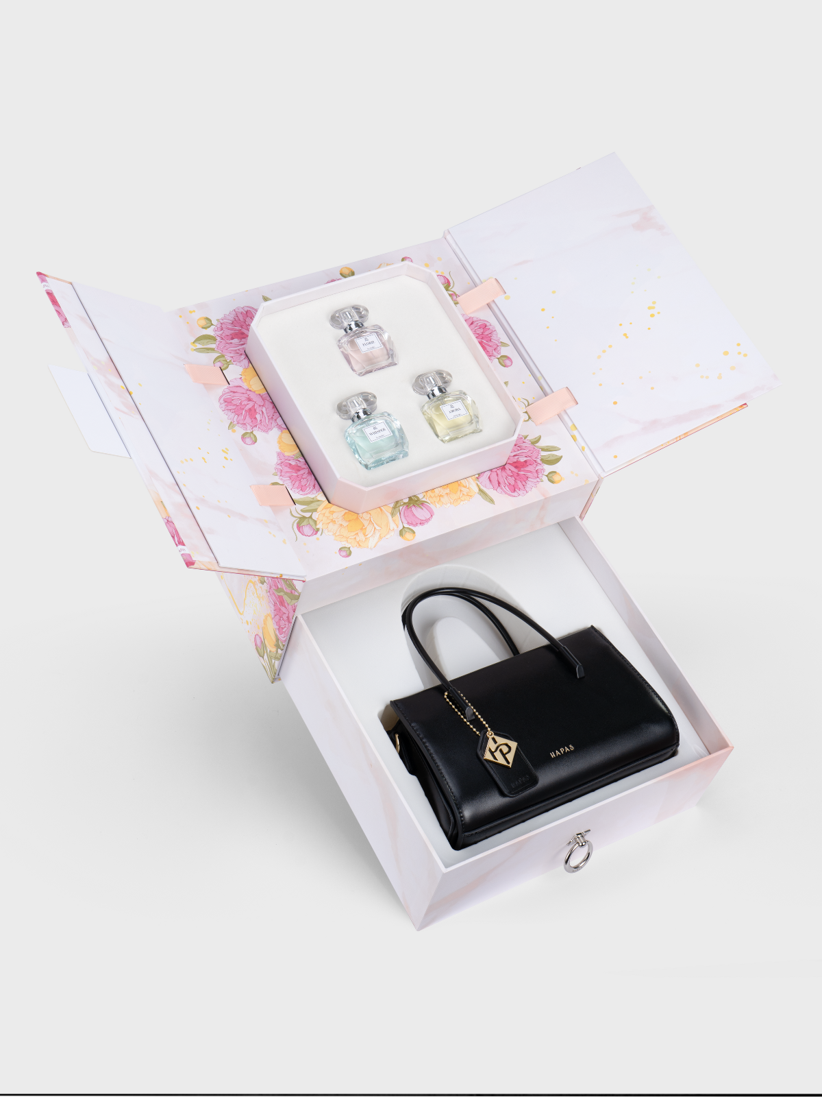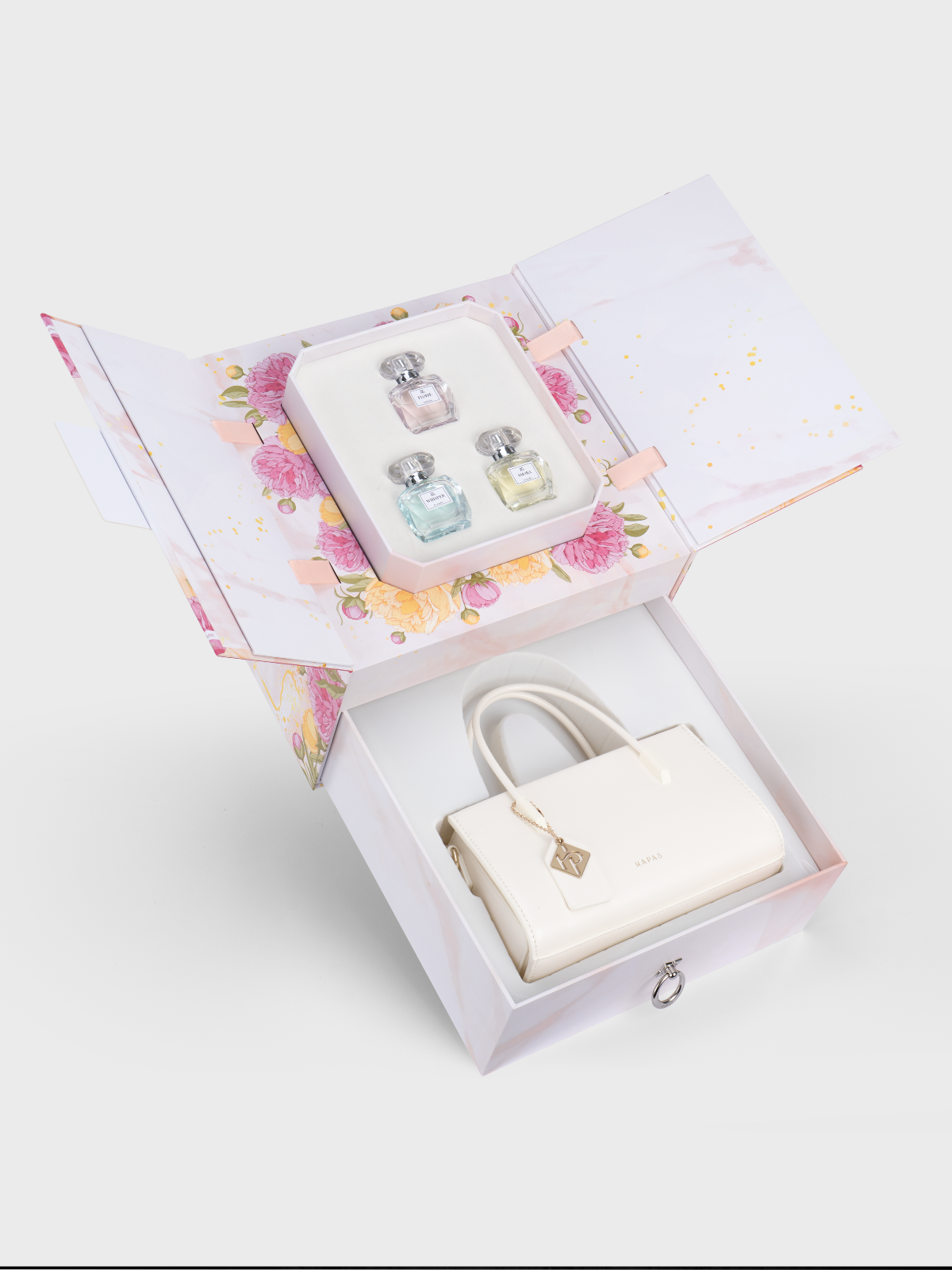 - Tầng trên mở nắp 2 cánh: 3 lọ nước hoa 30ml 3 màu: hồng/ vàng/ xanh