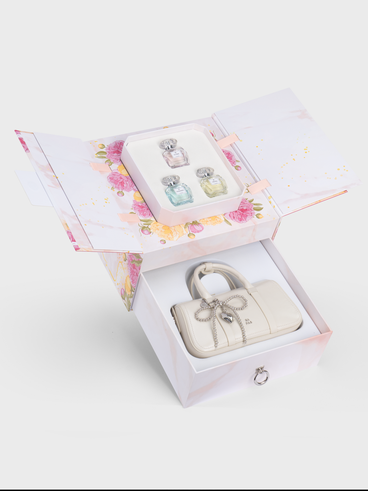 - Tầng trên mở nắp 2 cánh: 3 lọ nước hoa 30ml 3 màu: hồng/ vàng/ xanh