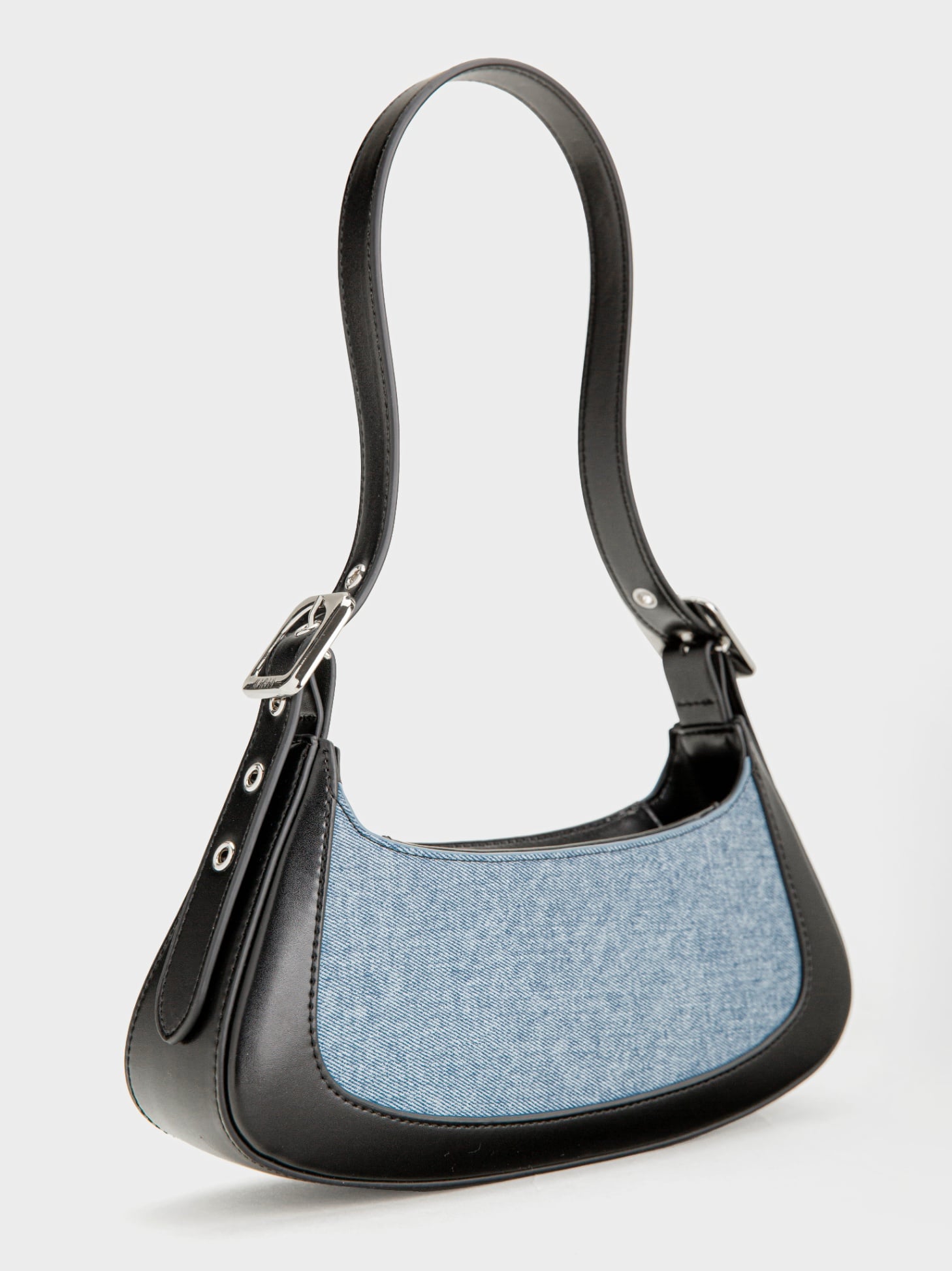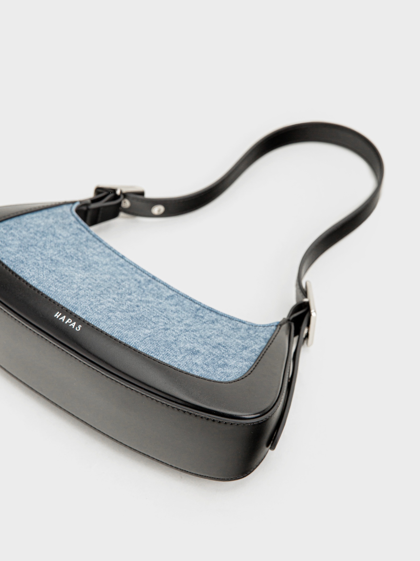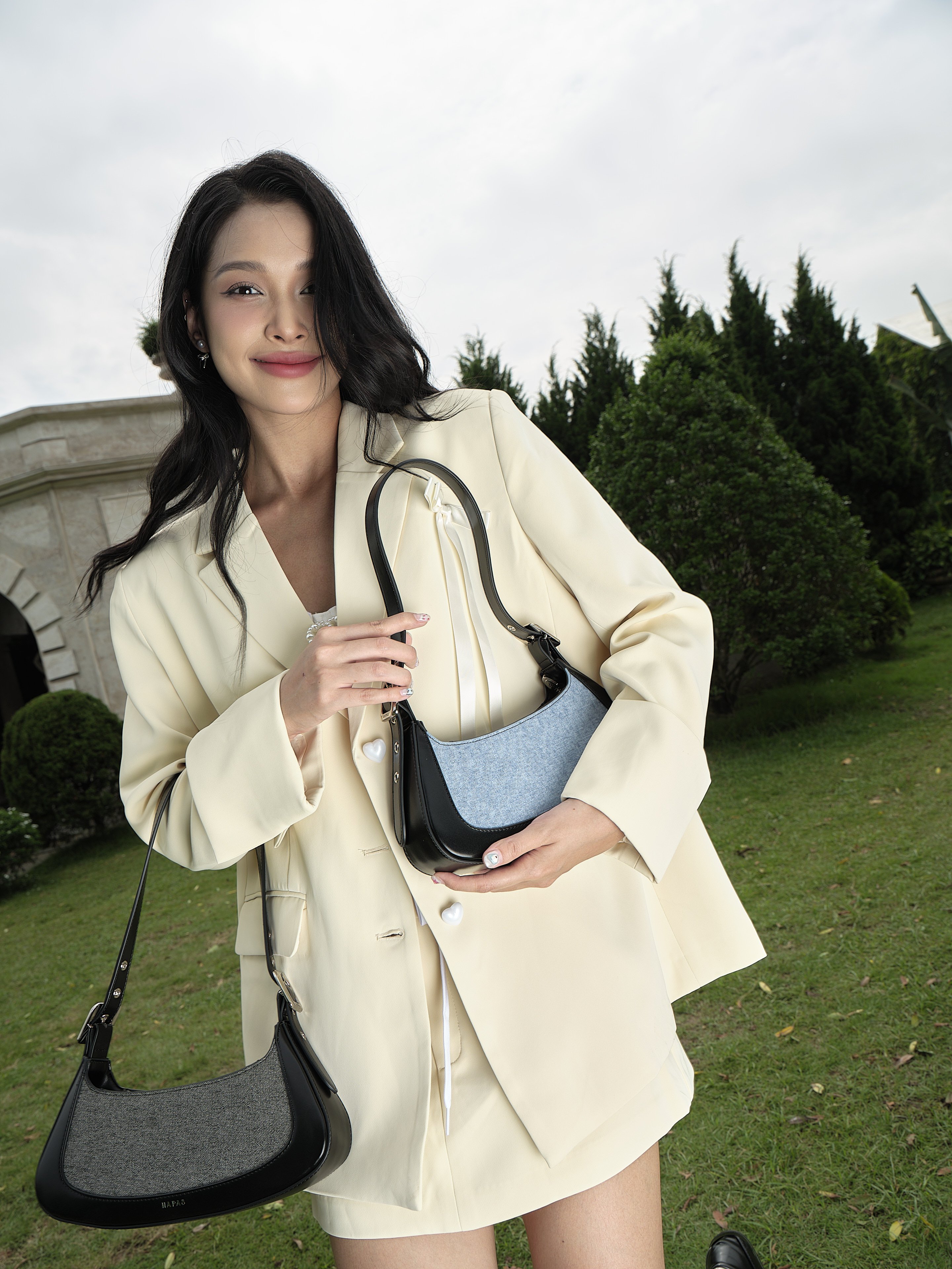 - Chất liệu PU phối cùng vải jean mang đến sự kết hợp hài hòa giữa cá tính và hiện đại